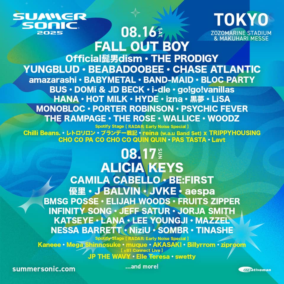 2025年8⽉16⽇(⼟)・17(⽇)に千葉・ZOZOマリンスタジアム&幕張メッセ、大阪・万博記念公園の2会場にて開催される「SUMMER SONIC 2025」(通称:サマソニ)の「Spotify Stage」出演アーティストが発表された。