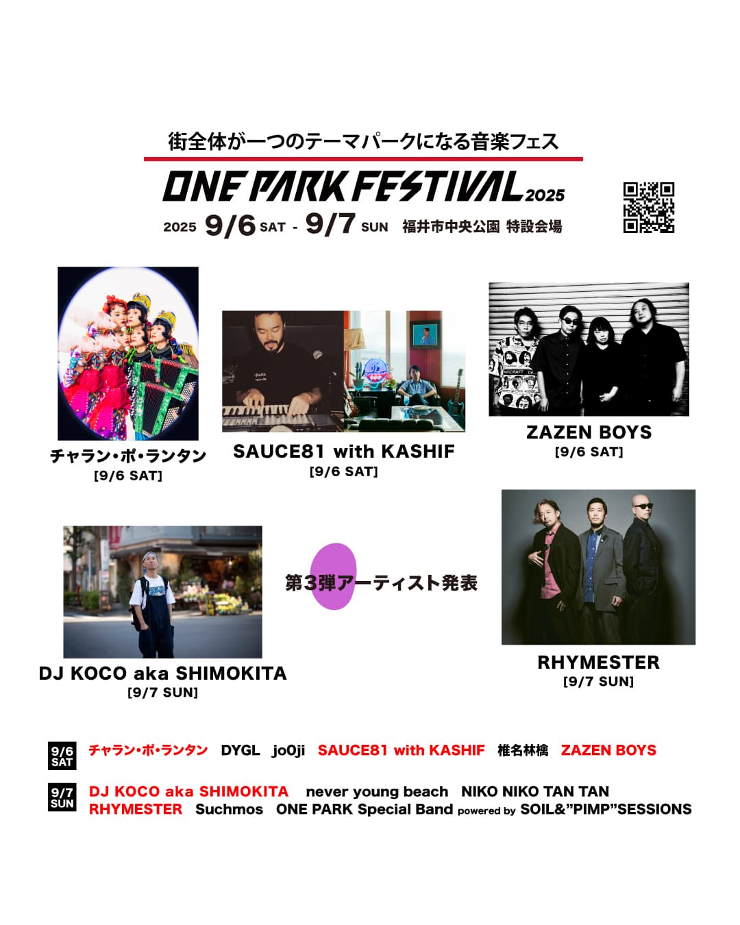 2025月9月6日(土)・7日(日)に、福井県福井市中央公園 特設会場にて開催される野外フェス「ONE PARK FESTIVAL 2025」の第3弾出演アーティストが発表された。
