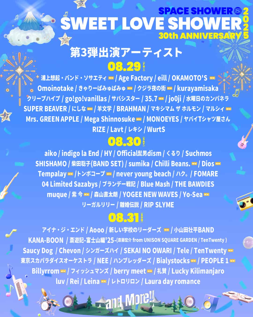 2025年8月29日(金)~31日(日)の3日間、山梨・山中湖交流プラザ きららにて開催される「SPACE SHOWER SWEET LOVE SHOWER 2025 30th ANNIVERSARY」(ラブシャ)の第3弾出演アーティストが発表された。