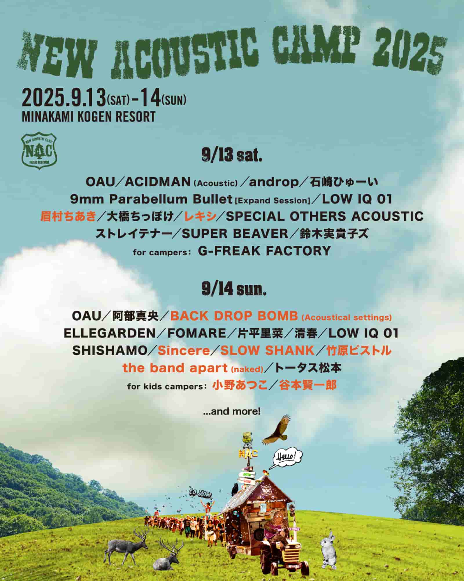 2025年9月13日(土)・14日(日)に、群馬・水上高原リゾート200にて開催される「New Acoustic Camp 2025 〜わらう、うたう、たべる、ねっころがる。〜」の第3弾出演アーティストが発表され、あわせて日割りも公開された。