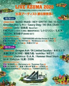 2025年10月18日(土)・19日(日)に福島・あづま総合運動公園 / 福島あづま球場にて開催される「LIVE AZUMA 2025」の第6弾出演アーティストと日割り発表され、JUBEE、Summer Eyeら19組追加。
