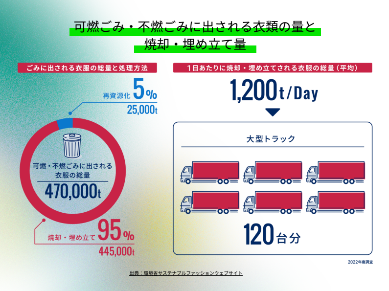 エバンズ:いいですね。実は、ほかの方がそのまま着てもらうリユースが、もっとも環境負荷の低い方法なんです。環境省が公表しているデータでは、不要になった服は7割(66%)近くが「可燃ゴミ」として処分または埋めたてられてしまっています。一方で、古着として販売されるのは7%しかありません。※手放す手段として