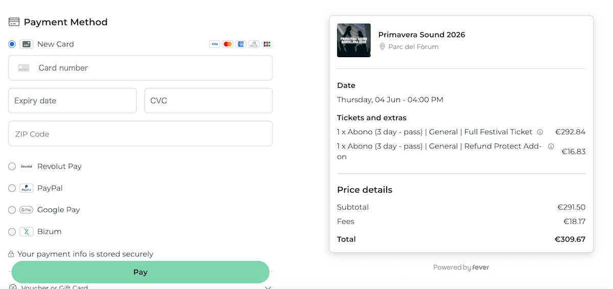 購入方法はシンプルで、公式サイトからチケット販売プラットフォーム(fever、AccessTicketなど)に遷移(下記写真はfeverの画面)し、「メールアドレス」「名前」「国籍」などを記入し、クレジットカード、apple pay、paypalなどで決済可能。Refund付きプランにすると、購入後にリセールも可。購入後に送られてくるメールやフェスの公式アプリ(事前にACCESS TICKETに連携が必要)をフェス当日にエントランスで掲示し、リストバンドに交換して入場できる。