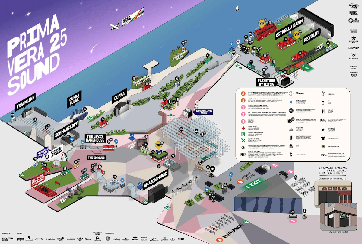 木〜土曜の3日間の開催となるが、本祭前の月〜水曜、さらに開催後の日曜にも都心部のライブハウスで関連イベント(Primavera a la Ciutat)が行われる。本祭に出演するアーティストが出演する場合もあるし、本祭には出演せずライブハウスのみに出演するアーティストも(2025年はKNEECAPがフェス後のライブハウスのみに出演し話題に)。この辺りのスケジュールも踏まえてバルセロナの滞在期間を決めるとベター。ちなみにフェスのチケット保有者は無料で参加できるがアプリ(2025年はACCESS TICKETというアプリ)からの事前予約が必要。