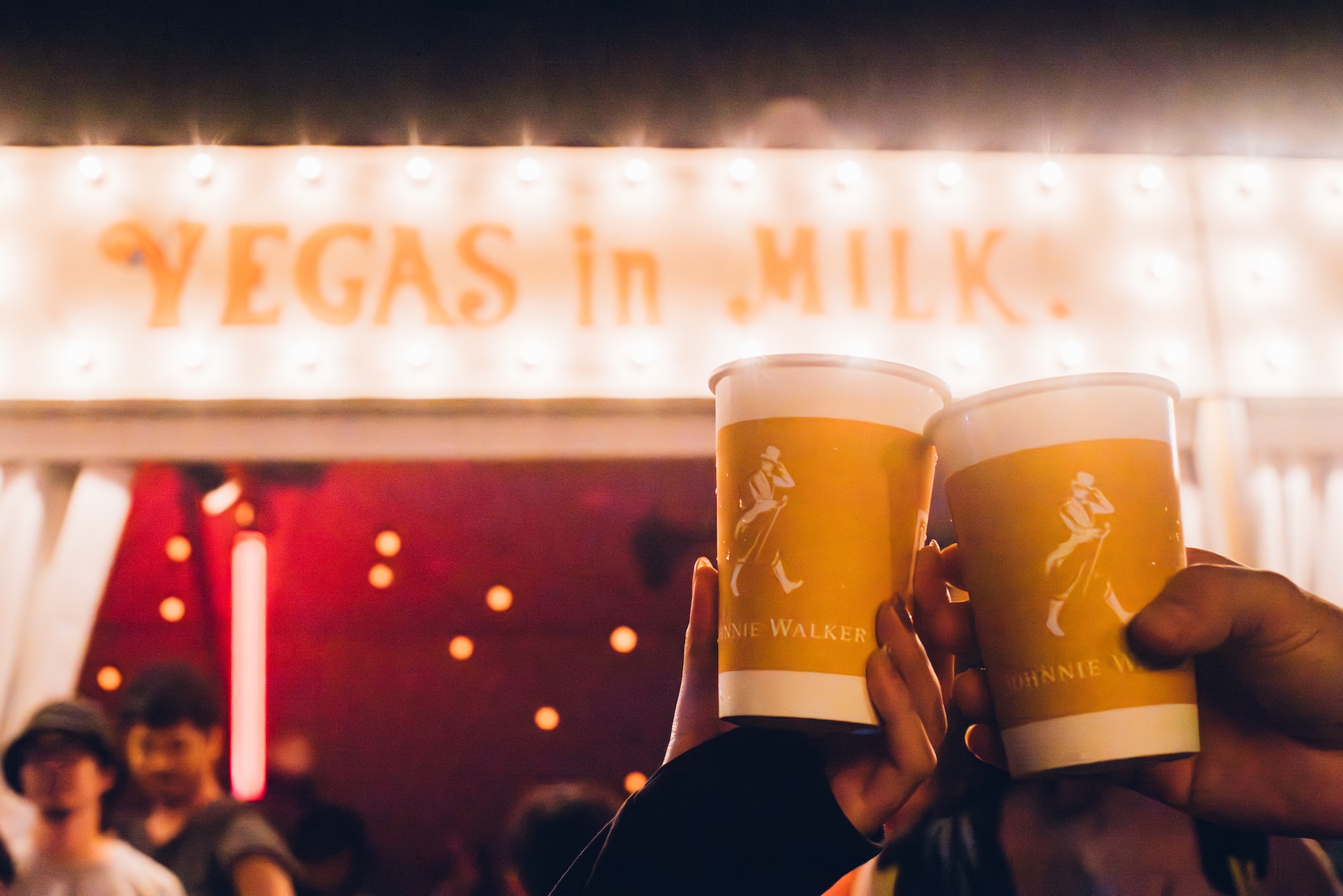 今年はそんなパレス・オブ・ワンダー内のバー「ベガスインミルク」をジョニーウォーカー(Johnnie Walker)がサポート。黄色いカップを片手に、夜な夜な集まったフジロッカーたちはシークレットライブに踊り、朝日を浴びるまで騒ぎ通した ── それぞれの苗場の夜が交差した“パレス”の様子をFestival Life編集部がレポート。