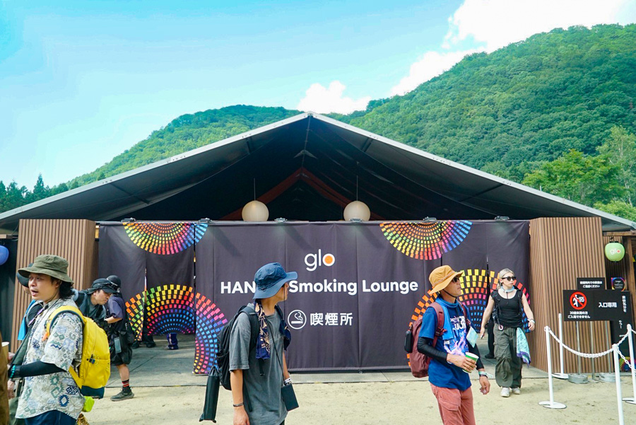 gloは、オレンジカフェにて屋台をテーマにした喫煙ブース「glo™ HANABI Smoking Lounge」を出展。輪投げやおみくじ、フォトブースなどで来場者を楽しませ、ラフィックデザイナー・丸井元子(MOTTY)氏がデザインした数量限定デバイス「グロー・ハイパー・プロ・ハナビ・エディション」も販売された。特別な空間でタバコ休憩を楽しみながら、リラックスしたひとときを過ごすフジロッカーを目撃。