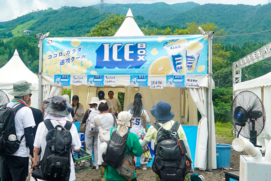 森永アイスボックスは、「アイスボックス<グレープフルーツ>」をクールダウンアイテムとして販売。“超涼めるブース”と題したブースには、ミストやクーラーを設置。さらに“ミスト隊”が待機列にアイスボックスミストを噴射。加えて、フジロック全体の運営スタッフにも「アイスボックス<グレープフルーツ>」を提供し、炎天下で奮闘するスタッフの暑さ対策もサポート。