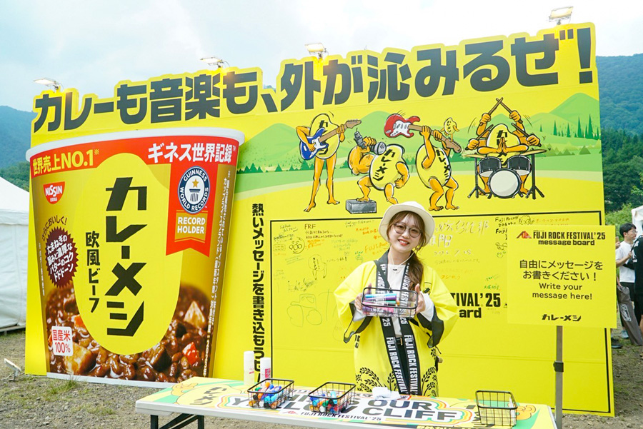 日清カレーメシは“熱湯協賛”として、無料給湯スポットを提供。会期中は深夜・早朝限定でお湯が配布され、カレーメシ(1個500円)の販売も行われた。お湯はカレーメシ以外の食事にも利用できる仕様で、朝晩が冷えるキャンプサイトでありがたい存在だった。さらにイエロークリフでも、巨大なカレーメシパッケージやメッセージボード、カレーメシデザインの飲食テーブルも設置され、訪れる人々の目を楽しませていた。