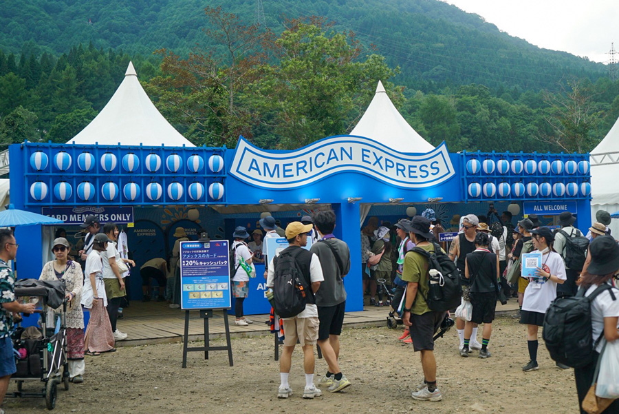 アメリカン・エキスプレスは、カード会員向けにプレゼント企画やキャッシュバックキャンペーンを実施。会期前には、新規入会者を対象にした特別キャンペーンとして、フジロックのチケットやホテル宿泊、限定Tシャツ、ドリンクチケットなどが当たる企画を展開。さらに会場では、対象カードでの決済に応じて、会場内外の対象店舗で最大5,000円のキャッシュバックが受けられる特典も用意。フジロックにおけるキャッシュレス決済を後押しした。
