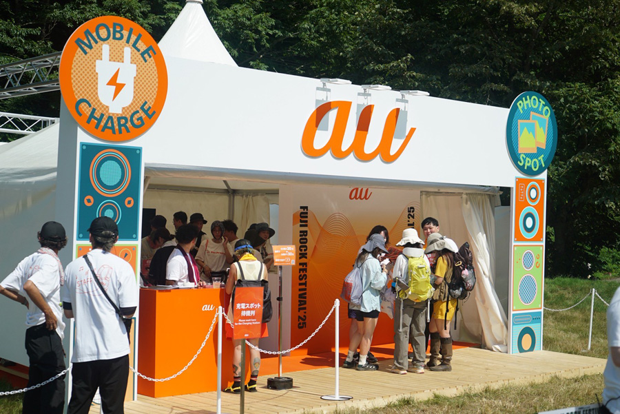 auは、大自然の中で開催されるフジロックでのライフラインとなるスマホの“充電”スポットを提供。また、グリーンステージ後方に設置されたブースでは、フォト&ゲームスポットや、オリジナルグッズのプレゼント企画を実施し、充電待ちのフジロッカーがのんびり楽しむ様子が見られた。また、エリアをカバーする車載型基地局や、会場の一部ではフリーWi-Fi「フェスWi-Fi」を導入し、フジロックの”通信環境“もサポート。