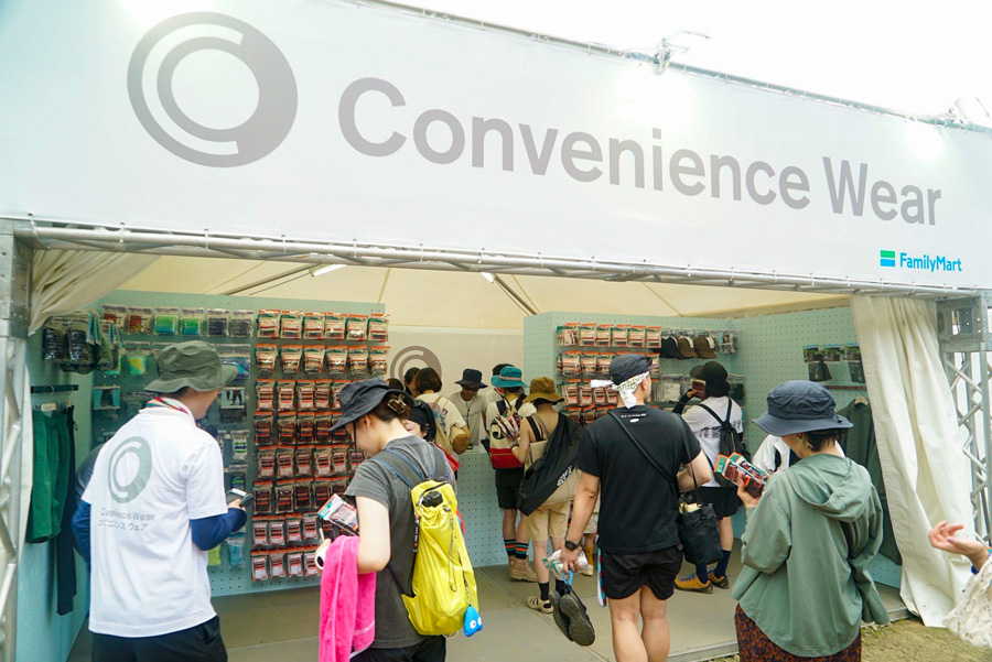 コンビニエンスウェアは、3年目となる今年もコラボレーションを展開。ソックスや今治タオルハンカチ、今治マフラータオルなどを会場で販売。今年はさらに、会場ポップアップストア限定商品として、フジロックコラボソックスのキッズサイズが初登場。天候が崩れた2日目には、新品のソックスや雨で濡れた身体を拭くためのタオルを求めて、多くのフジロッカーが列をなし、賑わいを見せていた。