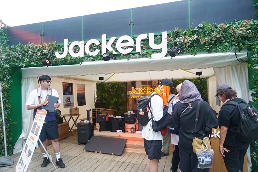フジロックへのサポートは2度目となるジャクリのブースでは、エアコンやサーキュレーター、氷の演出で、目でも肌でも感じられる“クールダウンスポット”を展開。内装には廃材を活用し、自然を表現したフォトスポットなどで自然共生の世界を体感できる空間も提供された。持ち運びしやすいポータブル電源やソーラーパネルの販売も行われ、涼しさと便利さ便利さが詰まったブースとなった。