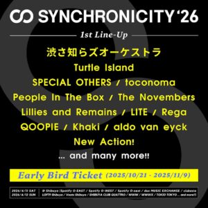 2026年4月11日(土)・12日(日)に東京・渋谷にて開催される「SYNCHRONICITY’26」(シンクロニシティ)の第1弾出演アーティストが発表され、渋さ知らズオーケストラ、Turtle Island、SPECIAL OTHERS、toconomaら13組出演決定。
