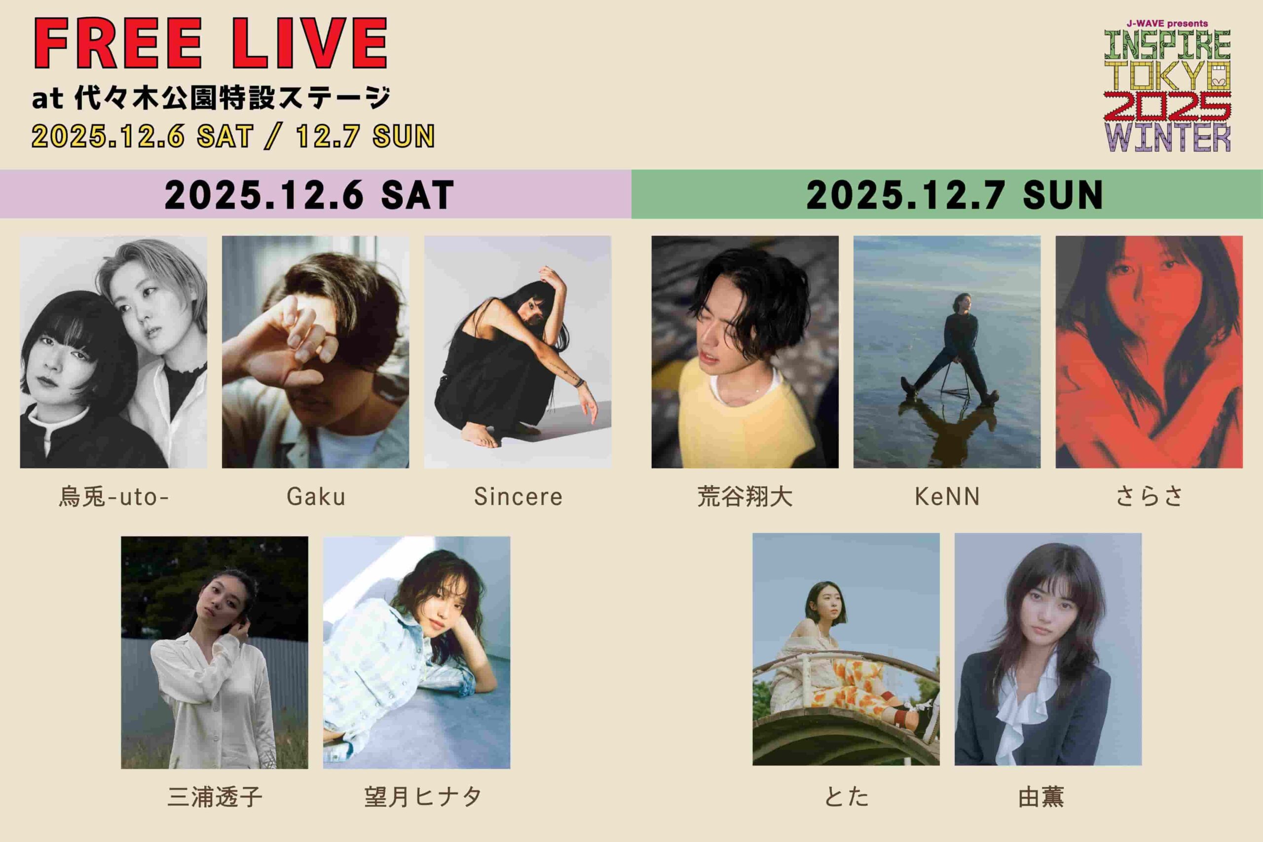 2025年12月5日(金)~7日(日)に東京・代々木公園イベント広場にて開催される「J-WAVE presents INSPIRE TOKYO 2025 WINTER ~Best Music & Market~」のフリーライブの出演アーティストが公開となった。