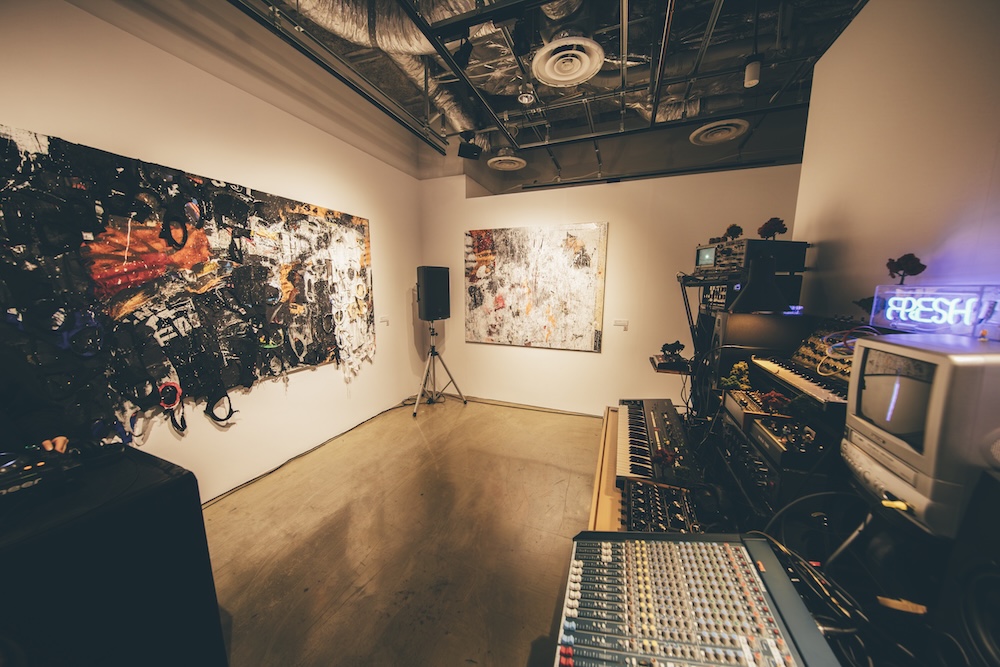 展示のラストとなる〈現在、そして未来へ〉は、これまでの歴史を継承しつつ、フジロックの未来も見据えた表現が展開されている。GAN-BANの初代店長で現代美術家のShohei Takasakiによる、過去のフライヤーやTシャツを用いたキャンバス作品は、これまでの歴史をアートで再構築していた。また、展覧会のティザーを制作したグラフィックデザイナー・Kamikeneによる音波インスタレーションは、その実験的なビジュアルとギミックが展覧会の空間に馴染んでいた。