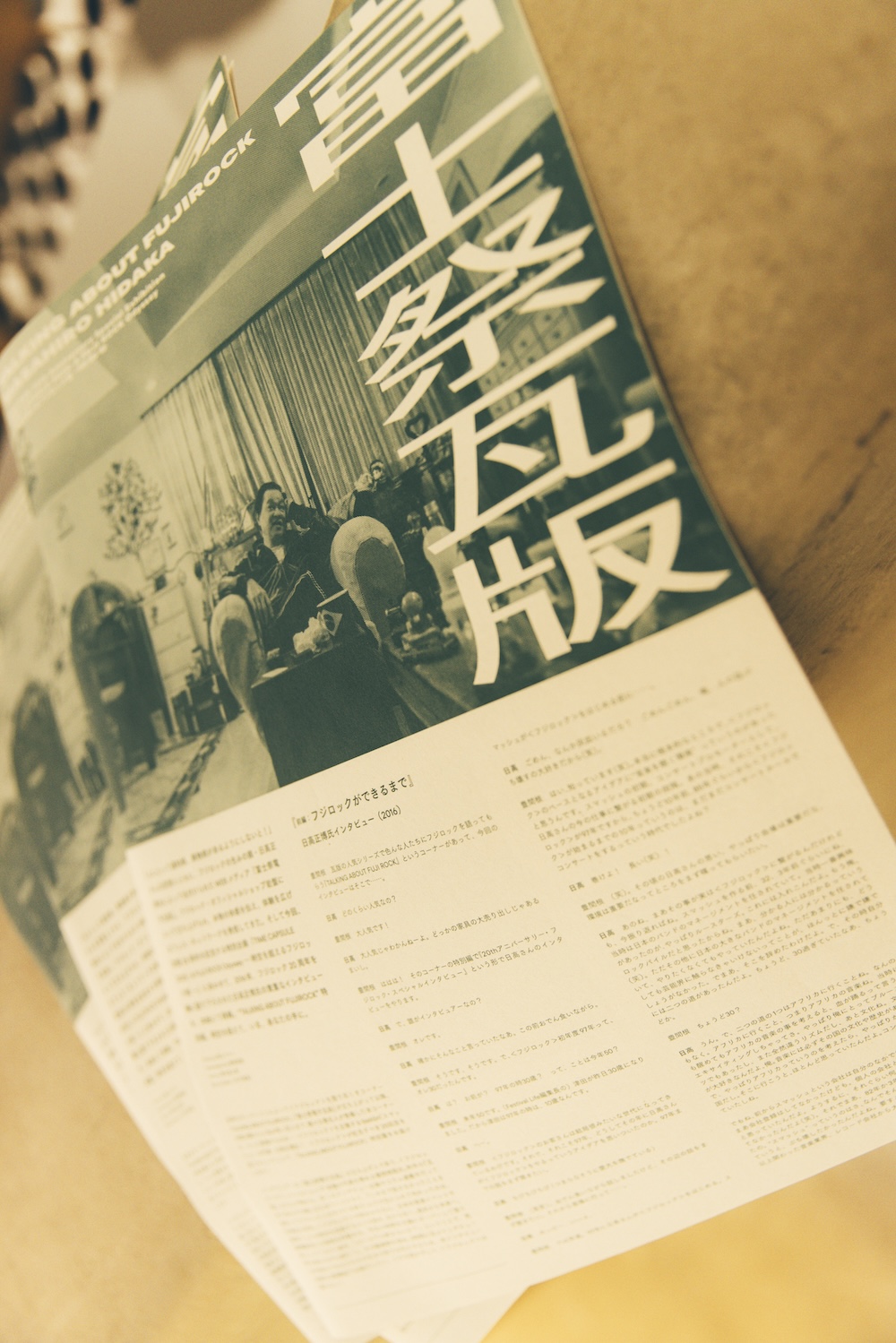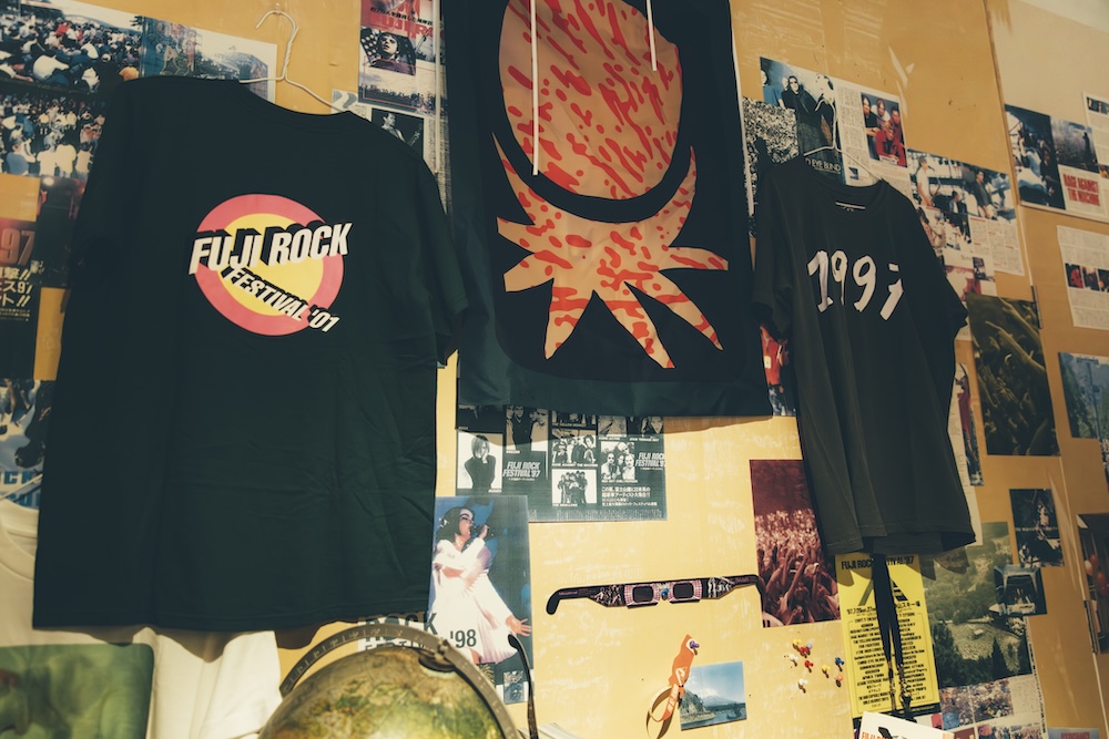 さらに奥に進むと現れる〈タイムカプセル〉のエリアは、歴代フジロックのビジュアルをプリントした232枚というフォトTシャツをはじめ、過去のアーカイブグッズや雑誌の記事の切り抜きなど、膨大な数のフジロックグッズで構成される。これらのアイテムは、各年代のフジロックの記憶を具体的なモノとして保存してきた有形文化財であり、そのものが多くを語りかける“証言”だ。