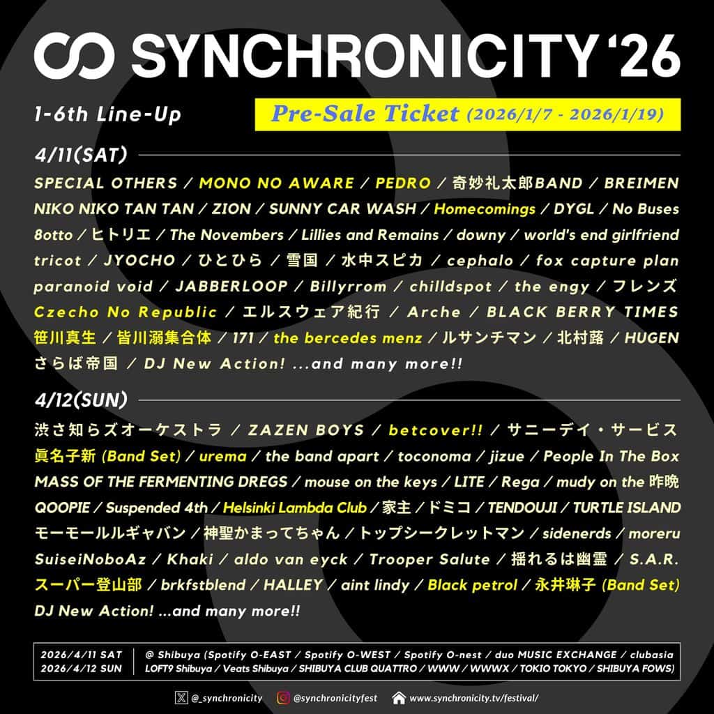 2026年4月11日(土)・12日(日)に東京・渋谷にて開催される「SYNCHRONICITY’26」(シンクロニシティ)の第6弾出演アーティストが発表された。