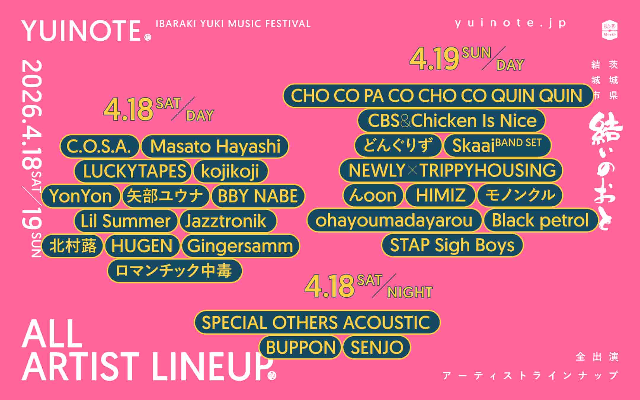 2026年4月18日(土)・19日(日)に茨城・結城市北部市街地にて開催される「結いのおと2026」の第3弾出演アーティストと日割りが発表された。