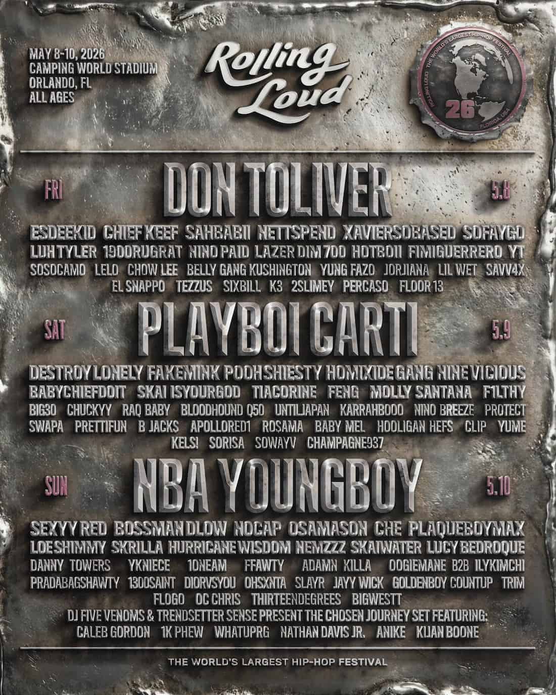 2026年5月8日(金)〜10日(日)にアメリカ・オーランド キャンピング・ワールド・スタジアムにて開催される「Rolling Loud」(ローリング・ラウド)のラインナップが発表された。