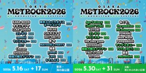 2026年5月16日(土)・17日(日)に東京・海の森公園にて、5月30日(土)・31日(日)に大阪・海とのふれあい広場にて開催される「METROCK2026」の第2弾出演アーティストが発表され、CANDY TUNE、YUTA(NCT)、超能力戦士ドリアン、東京スカパラダイスオーケストラら11組追加。