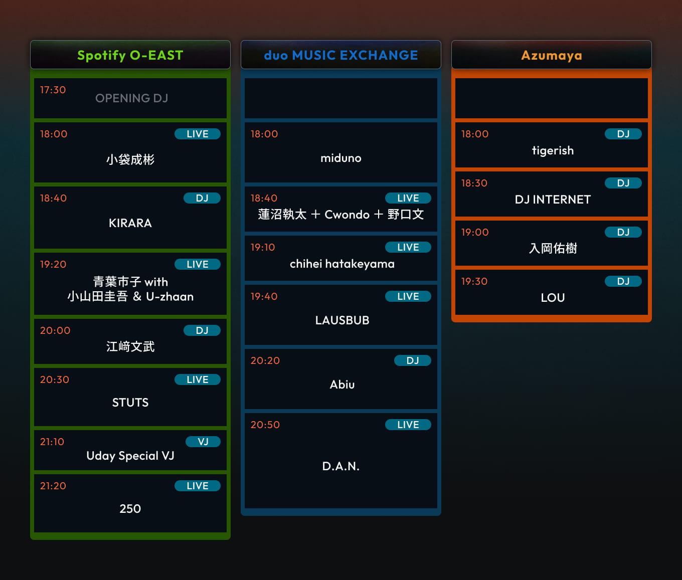 本イベントは、坂本龍一氏のレギュラープログラム『RADIO SAKAMOTO』の「意思」を受け継ぎ、進化・拡張させる一夜限りのトリビュート・フェスで、今回で2回目の開催となる。坂本氏に縁の深いアーティストたちが集結し、参加者はSpotify O-EAST/duo MUSIC EXCHANGE/東間屋の3会場を回遊しながらパフォーマンスを楽しむことができる。