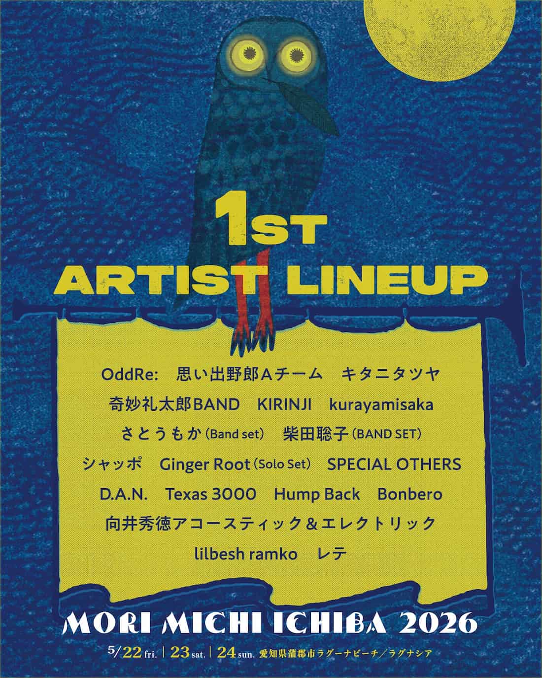 2026年5月22日(金)〜24日(日)に愛知県蒲郡市ラグーナビーチ&ラグナシアにて開催される「森、道、市場2026」の第1弾出演アーティストが発表された。