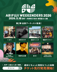 2026年5月16日(土)に兵庫県三田市 で開催する「ARIFUJI WEEKENDERS 2026」に、くるり、木村カエラ、在日ファンク、梅田サイファー、Mega Shinnosuke、奇妙礼太郎、赤犬、YONA YONA WEEKENDERS出演。