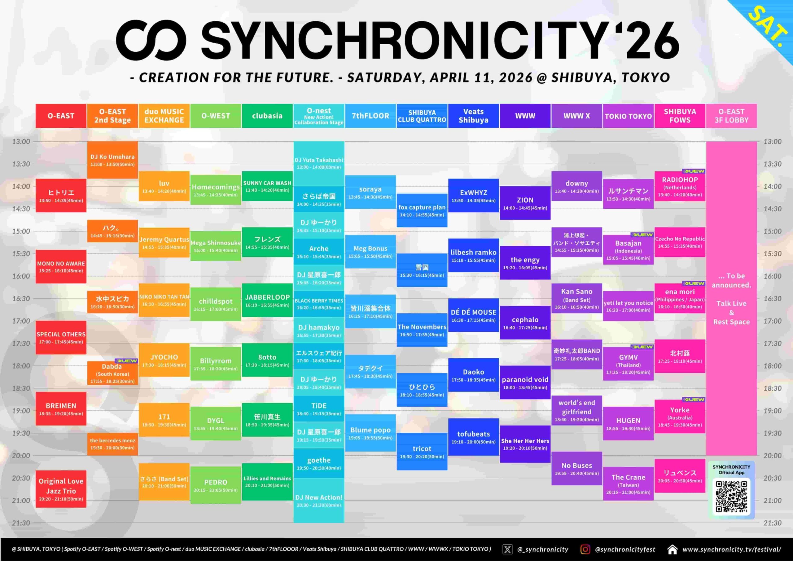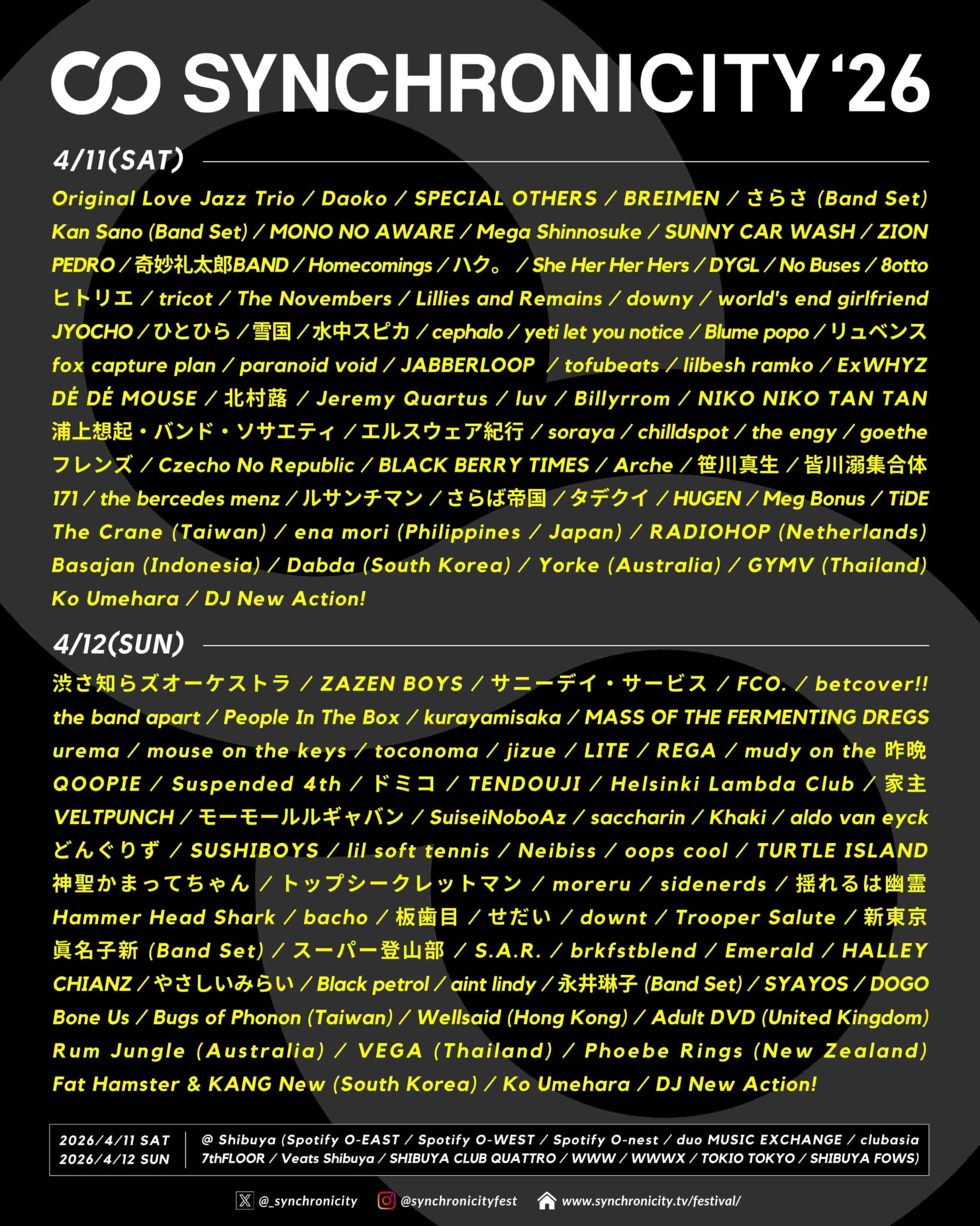 2026年4月11日(土)・12日(日)に東京・渋谷にて開催される「SYNCHRONICITY’26」(シンクロニシティ)のタイムテーブルが発表された。