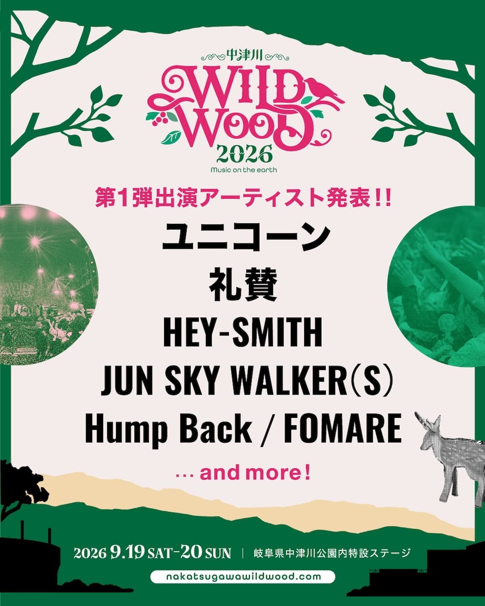 2026年9月19日(土)・20日(日)に岐阜県中津川公園内特設ステージにてい開催される「中津川 WILD WOOD 2026」の第1弾出演アーティストが発表となった。