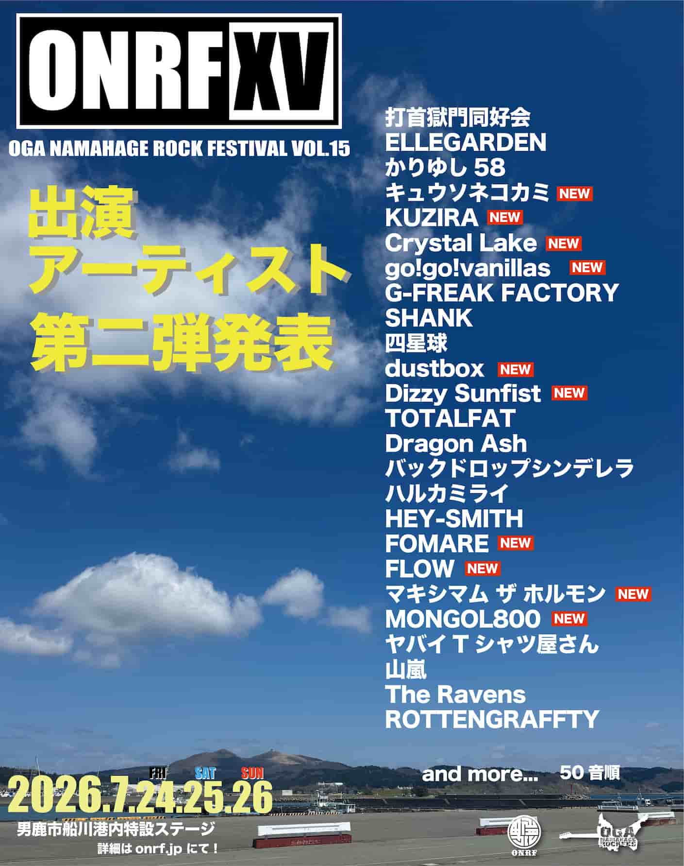 2026年7月24日(金)~26日(日)に秋田・男鹿市船川港内特設ステージにて開催される「OGA NAMAHAGE ROCK FESTIVAL vol.15」(男鹿ナマハゲロックフェスティバル)の第2弾出演アーティストが発表された。