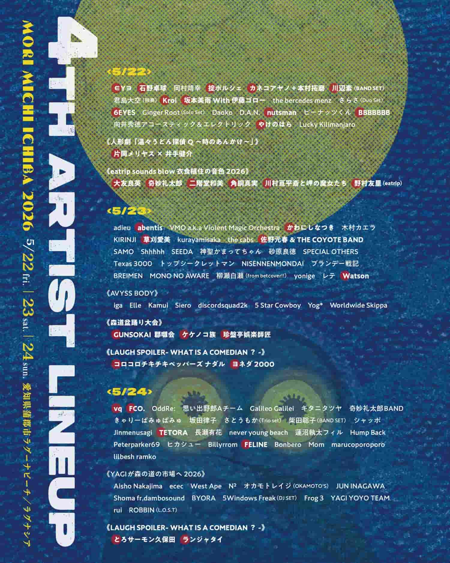 2026年5月22日(金)〜24日(日)に愛知県蒲郡市ラグーナビーチ&ラグナシアにて開催される「森、道、市場2026」の第4弾出演アーティストが発表された。