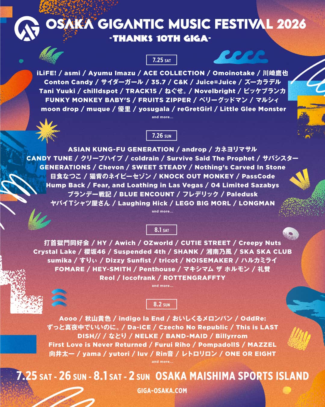2026年7月25日(土)・26日(日)、8月1日(土)・2日(日)に大阪・舞洲スポーツアイランドにて開催される「OSAKA GIGANTIC MUSIC FESTIVAL 2026 -THANKS 10TH GIGA-」(ジャイガ)の第5弾出演アーティストが発表された。