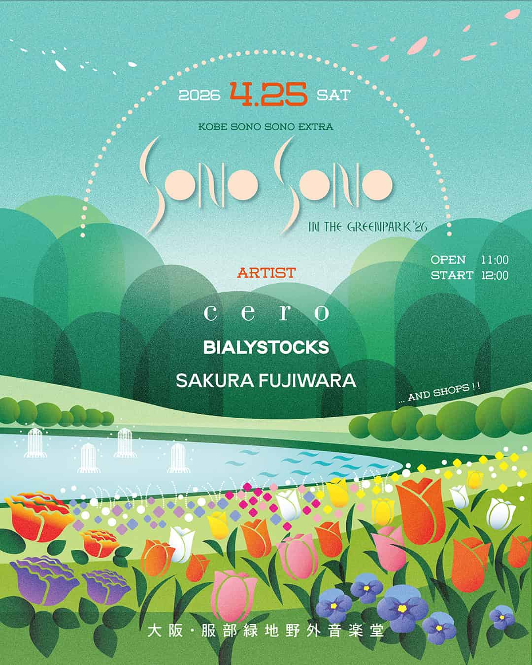 シェア 開催概要 日程 2026/04/25(土) 会場 大阪 服部緑地野外音楽堂 ジャンル 屋外1DAY 会場・アクセス 大阪府豊中市服部緑地1-7 Googleマップを開く 最新ニュース 2025.3.2 4月大阪「SONO SONO in the greenpark」第2弾発表で浦上想起・バンド・ソサエティ、YOGEE NEW WAVESの2組追加 2025年4月12日(土)に大阪・服部緑地野外音楽堂にて「SONO SONO in the greenpark」の第2弾出演アーティストが発表され、浦上想起・バンド・ソサエティ、YOGEE NEW WAVESの2組が出演決定。 2025.1.30 4月大阪「SONO SONO in the greenpark」開催決定。第1弾発表でCHO CO PA CO CHO CO QUIN QUINら3組決定 2025年4月12日(土)に大阪・服部緑地野外音楽堂にて開催される「SONO SONO in the greenpark」の第1弾出演者が発表され、CHO CO PA CO CHO CO QUIN QUINら3組決定。 2024.2.21 4月神戸「KOBE SONO SONO ’24」メインステージ全出演者発表でトータス松本、グソクムズ、藤原さくら、maya ongakuら6組追加 2024年4月6日(土)に兵庫・道の駅神戸フルーツ・フラワーパーク大沢にて開催される「KOBE SONO SONO ’24」のメインステージ全出演者が発表され、角舘健悟(Yogee New Waves)、グソクムズ、トータス松本、藤原さくら、maya ongaku、名誉伝説ら6組が追加された。 2023.12.16 4月神戸「KOBE SONO SONO ’24」第1弾発表でKIRINJI、Homecomings、奇妙礼太郎ら6組決定 2024年4月6日(土)に兵庫・道の駅神戸フルーツ・フラワーパーク大沢にて開催される「KOBE SONO SONO ’24」の第1弾出演アーティストが発表され、KIRINJI、Hmecomings、奇妙礼太郎ら6組決定。 関連サイト オフィシャルサイト Instagram X(旧Twitter) 全国フェス検索 開催月検索 1月2月3月4月5月6月7月8月9月10月11月12月 エリア検索 北海道/東北関東北陸/甲信越東海関西中国/四国九州/沖縄オンライン タイプ別検索 屋外屋内キャンプサーキット1DAYオールナイト無料オンライン