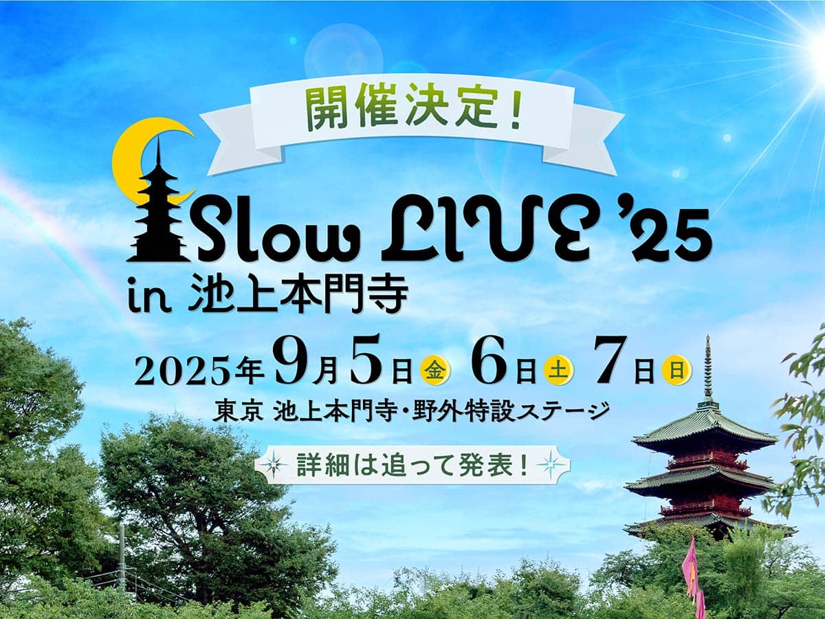 シェア 開催概要 日程 2025/09/05(金) - 09/07(日) 会場 東京 池上本門寺・野外特設ステージ ジャンル 屋外 会場・アクセス 東京都大田区池上1-1-1 Googleマップを開く 最新ニュース 2023.8.4 大人のミニフェス「Slow LIVE’23」オープニングアクトにHana Hope、由薫、森大翔ら5組決定 2023年9月1日(金)~3日(日)に東京・池上本門寺にて開催される「Slow LIVE’23 in 池上本門寺 20th Anniversary」のオープニングアクトが発表され、Rei Wada、CLOW、由薫、森大翔、Hana Hopeの5組決定。 2023.7.14 大人のミニフェス「Slow LIVE’23」第3弾発表で、碧海祐人、君島大空の2組追加 2023年9月1日(金)~3日(日)に東京・池上本門寺にて開催される「Slow LIVE’23 in 池上本門寺 20th Anniversary」の第3弾出演者が発表され、碧海祐人、君島大空の2組追加。 2023.6.9 大人のミニフェス「Slow LIVE’23」第2弾発表で、竹内アンナ、さらさの2組追加 2023年9月1日(金)~3日(日)に東京・池上本門寺にて開催される「Slow LIVE’23 in 池上本門寺 20th Anniversary」の第2弾出演者が発表され、竹内アンナ、さらさの2組追加。 2021.12.12 大人のミニフェス「Slow LIVE」3月に日比谷公園野外大音楽堂にて開催。GLIM SPANKYらアコースティック編成で出演 2022年3月5日(土)に東京・日比谷野外大音楽堂にて「Slow LIVE’22 Spring in 日比谷野外大音楽堂」が開催される。 関連記事 コラムリスト 2022.2.27 【2022年3月開催】 編集部ピックアップの春フェス6選&3月開催フェスまとめ 関連サイト オフィシャルサイト Facebook Instagram X(旧Twitter) 全国フェス検索 開催月検索 1月2月3月4月5月6月7月8月9月10月11月12月 エリア検索 北海道/東北関東北陸/甲信越東海関西中国/四国九州/沖縄オンライン タイプ別検索 屋外1!DAY屋内キャンプサーキット1DAYオールナイト無料オンライン