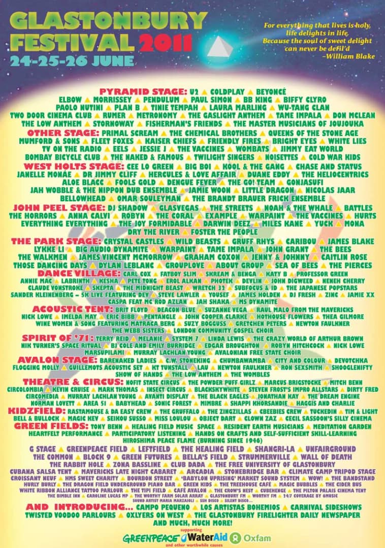 Morrissey / Biffy Clyro / B.B. King / Wu-Tang Clan / Two Door Cinema Club / Metronomy / The Master Musicians of Joujouka / Pyramid Stage / Elbow / Paolo Nutini / Tinie Tempah / Rumer / The Gaslight Anthem / Tame Impala / Stornoway / Pyramid Stage / Pendulum / Plan B / Paul Simon / Laura Marling / Don McLean / The Low Anthem / Fisherman’s Friends and more…